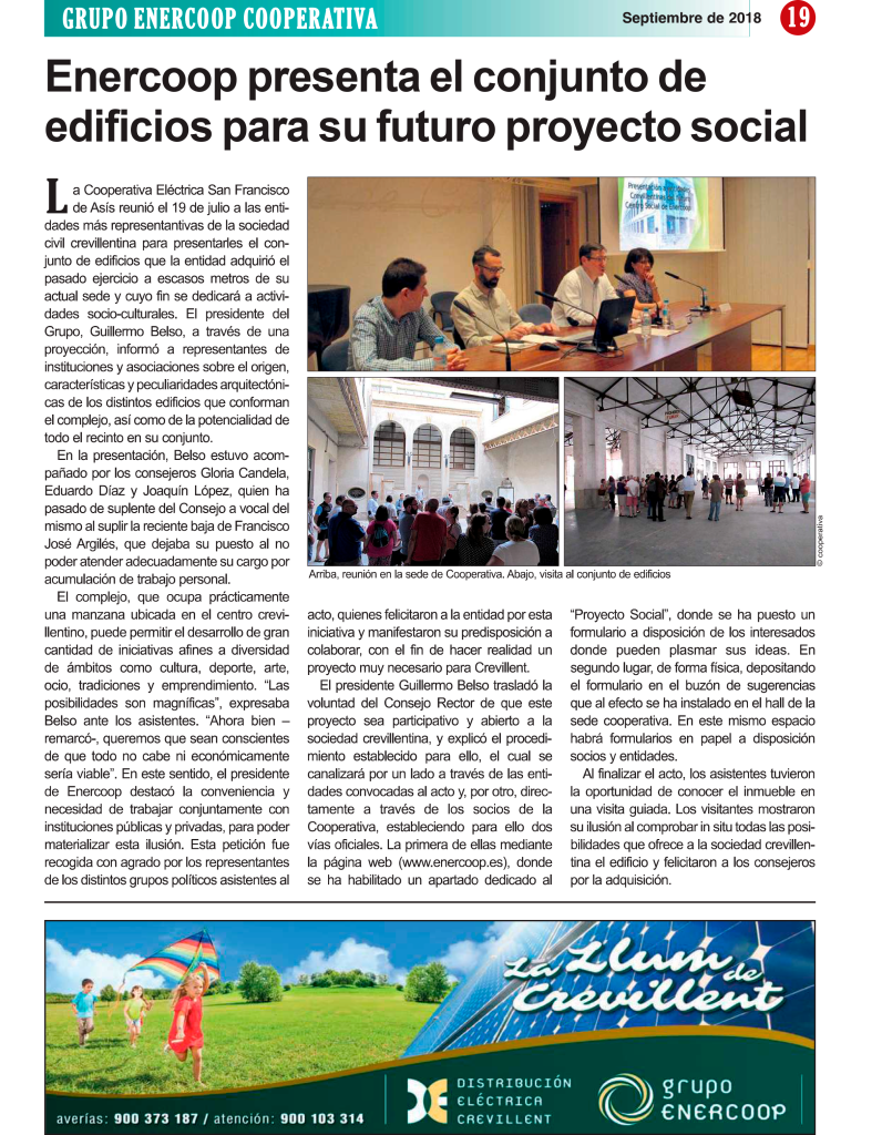 El complejo, que ocupa prácticamente una manzana ubicada en el centro crevillentino, puede permitir el desarrollo de gran cantidad de iniciativas afines a diversidad de ámbitos como cultura, deporte, arte, ocio, tradiciones y emprendimiento. «Las posibilidades son magníficas», expresaba Belso ante los asistentes, «Ahora bien –remarcó–, queremos que sean conscientes de que todo no cabe ni económicamente sería viable». En este sentido, el presidente de Enercoop destacó la conveniencia y necesidad de trabajar conjuntamente con instituciones públicas y privadas, para poder materializar esta ilusión. Esta petición fue recogida con agrado por los representantes de los distintos grupos políticos asistentes al acto, quienes felicitaron a la entidad por esta iniciativa y manifestaron su predisposición a colaborar, con el fin de hacer realidad un proyecto muy necesario para Crevillent.