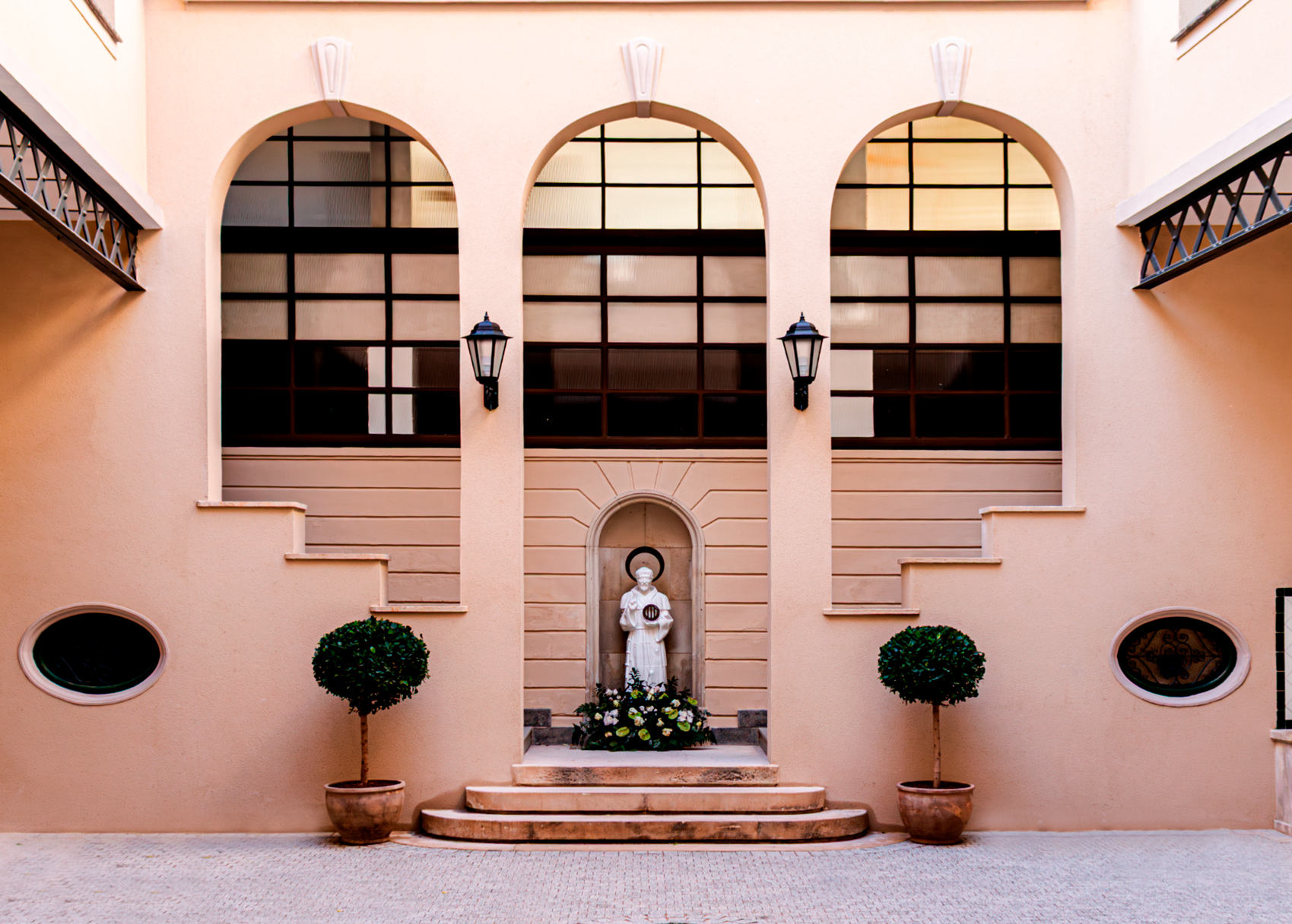 La entrada al Fōrum Enercoop está precedida por un señorial y singular atrio en estilo art dèco que aporta al conjunto un encanto especial. Compuesto por tres arcos coronados por un detalle ovalado, impresiona al visitante por la grandiosidad de una estructura que, a pesar de quedar encajada en un patio, prioriza las estructuras verticales aprovechando un recurso estético único.