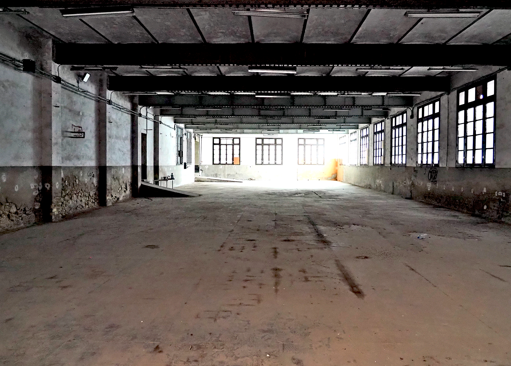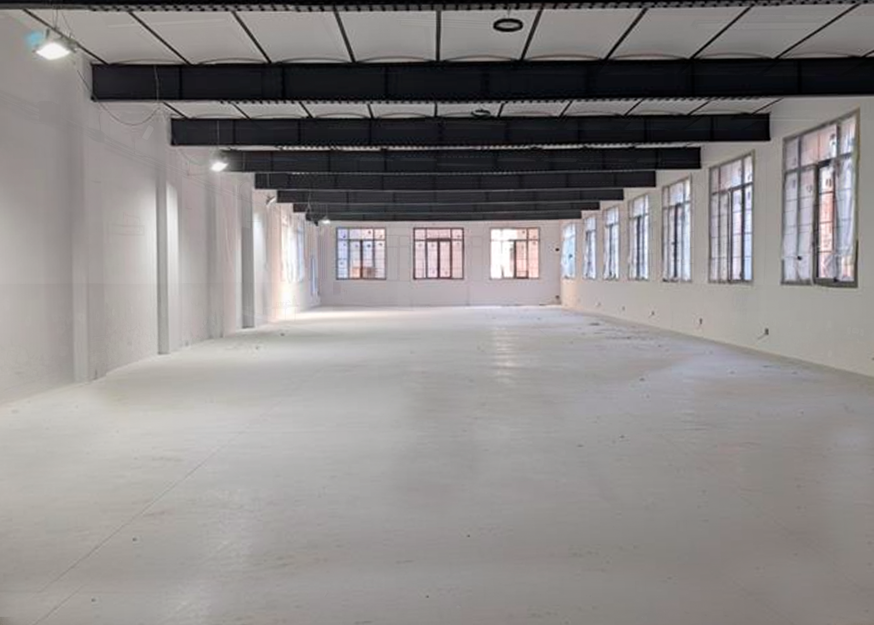 Los ventanales, clara seña de identidad del edificio, ofrecen una gran cantidad de luz y convierten la sala en un espacio idóneo para muestras y exposiciones. Para potenciar la ambivalencia del espacio, se ha preparado el suelo con un acabado super resistente que dará el soporte perfecto para una exposición muy exigente.